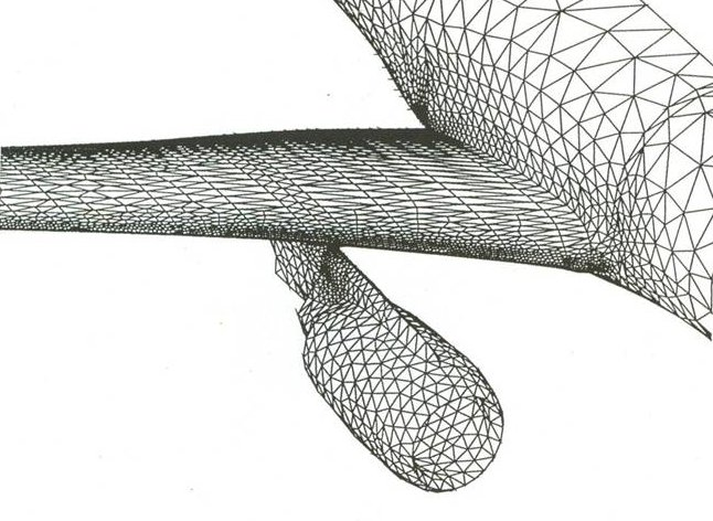 This example shows the mesh before and after solution-based refinement. The refinement added extra clustering along the leading and trailing edge of the wing as well as around the engine inlet.