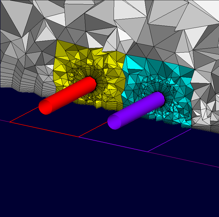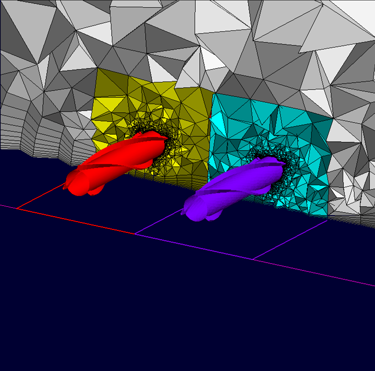 The shape of the pylon attaching an engine to the wing is varied. The first image shows the overall geometry with the engine region isolated in a separate zone. The two images below it show the two different pylon configurations that have been tried with this setup.